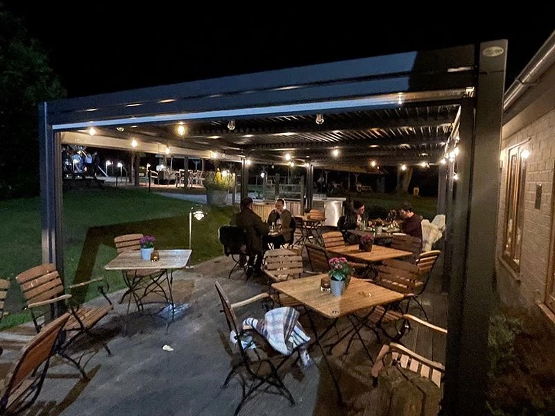 The shuttered roof when closed is completely waterproof but also has drainage channels housed within the shuttered sections which allows excess rainwater to drain off and down specially engineered channels on the inside of the legs and then out the bottom into the ground it’s anchored to.