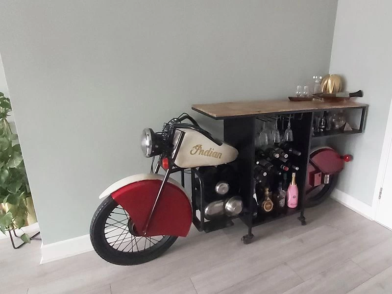 This design has been carefully hand-finished from a genuine decommissioned Indian Motorcycle split in two, lengthened, and fitted with a home bar unit complete with a wine rack placed in the middle!