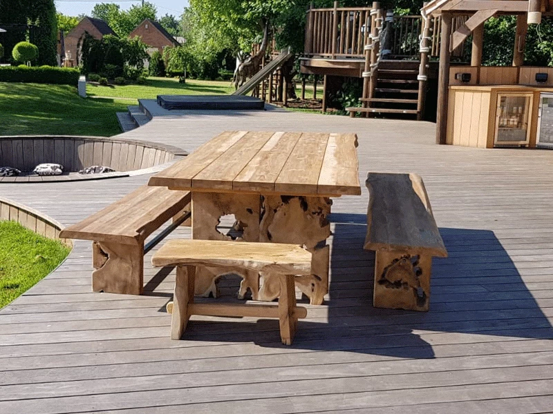 Solid panels of smoothly finished reclaimed teak root are used to form the legs on both the table and the benches that sit round it.