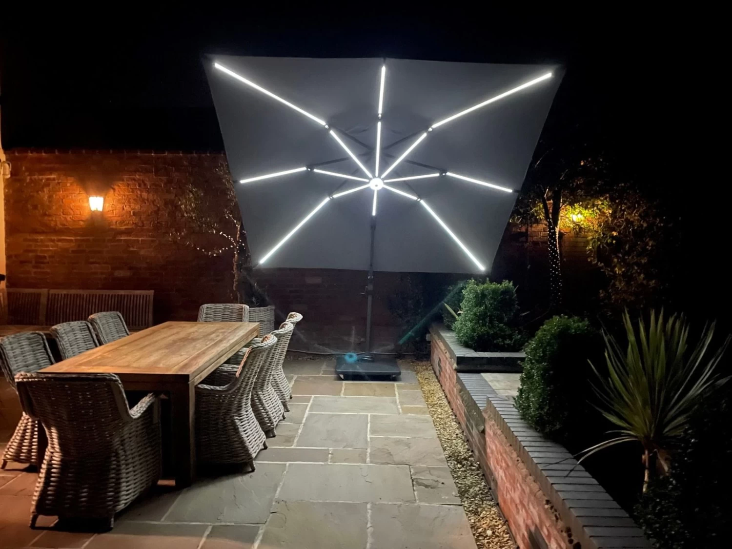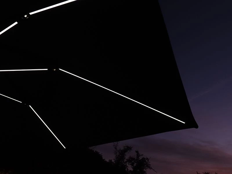 THIS SET INCLUDES PARASOL, PARASOL BASE, cross member section AND FREE WEATHER COVER AND LED LIGHTS ON THE RIBS AND CENTRE RUNNER.