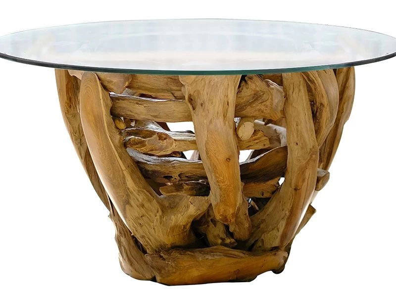 This table is finished with an 80cm diameter tempered glass top to allow the teak root underneath to still be visible.